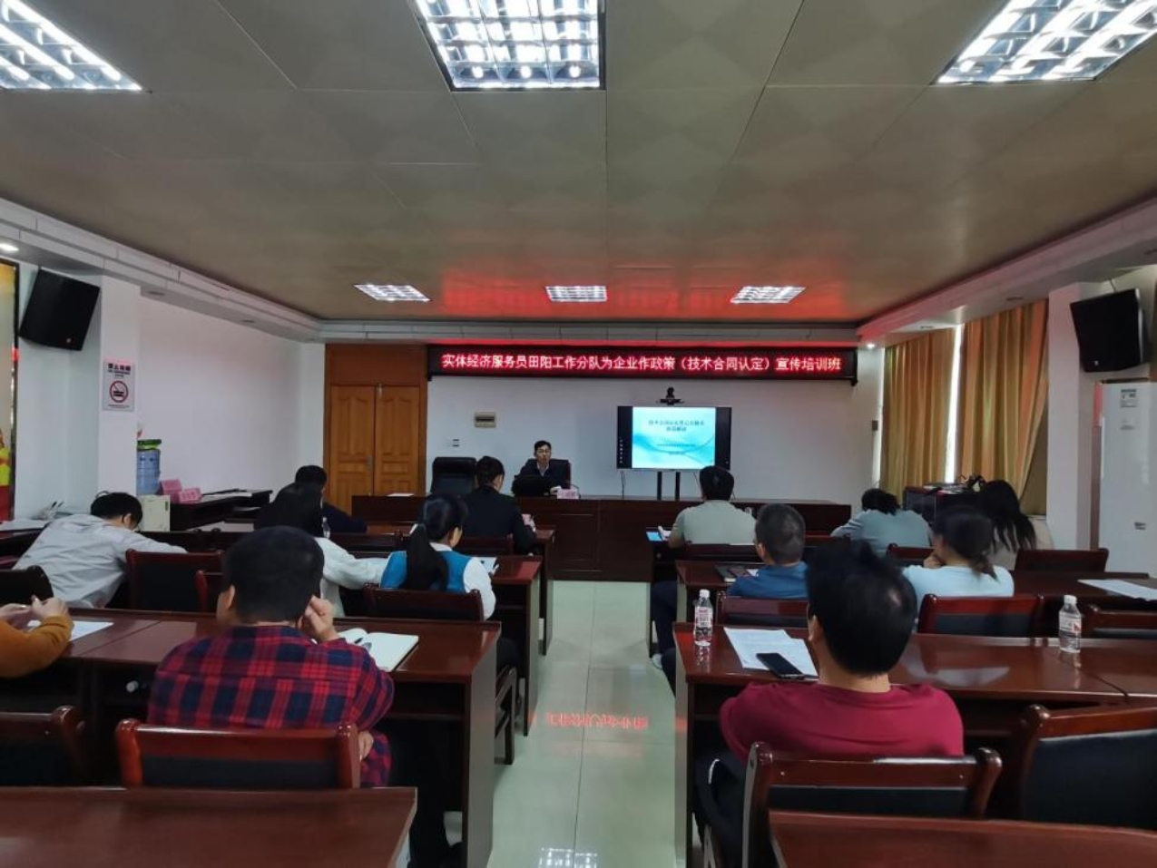 为深化企业技术合同认定登记工作,激发百色市田阳区企业科技创新活力,加速科技成果转化,提升企业综合竞争力。2024年11月20日上午,广西实体经济服务员驻百色市工作队田阳分队(以下简称“田阳分队”)联合田阳区工业和信息化局,共同举办了技术合同认定登记工作培训班,由田阳分队队员暨百色市科学技术信息研究所技术市场管理科科长黄俊慧作培训。