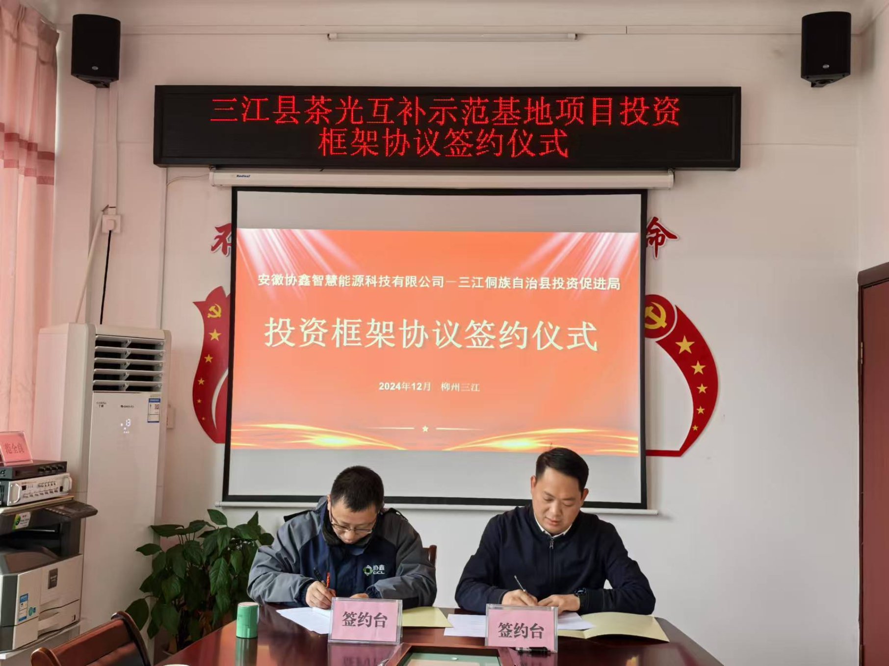 12月13日,三江县投资促进局与安徽协鑫智慧能源科技有限公司正式签订“茶光互补示范基地项目投资框架协议”,意味着三江县首个“茶光互补”示范项目正式落地三江。该项目目前在积极协调土地资源的整合,计划在2025年6月前完成1期投资1.2亿元。